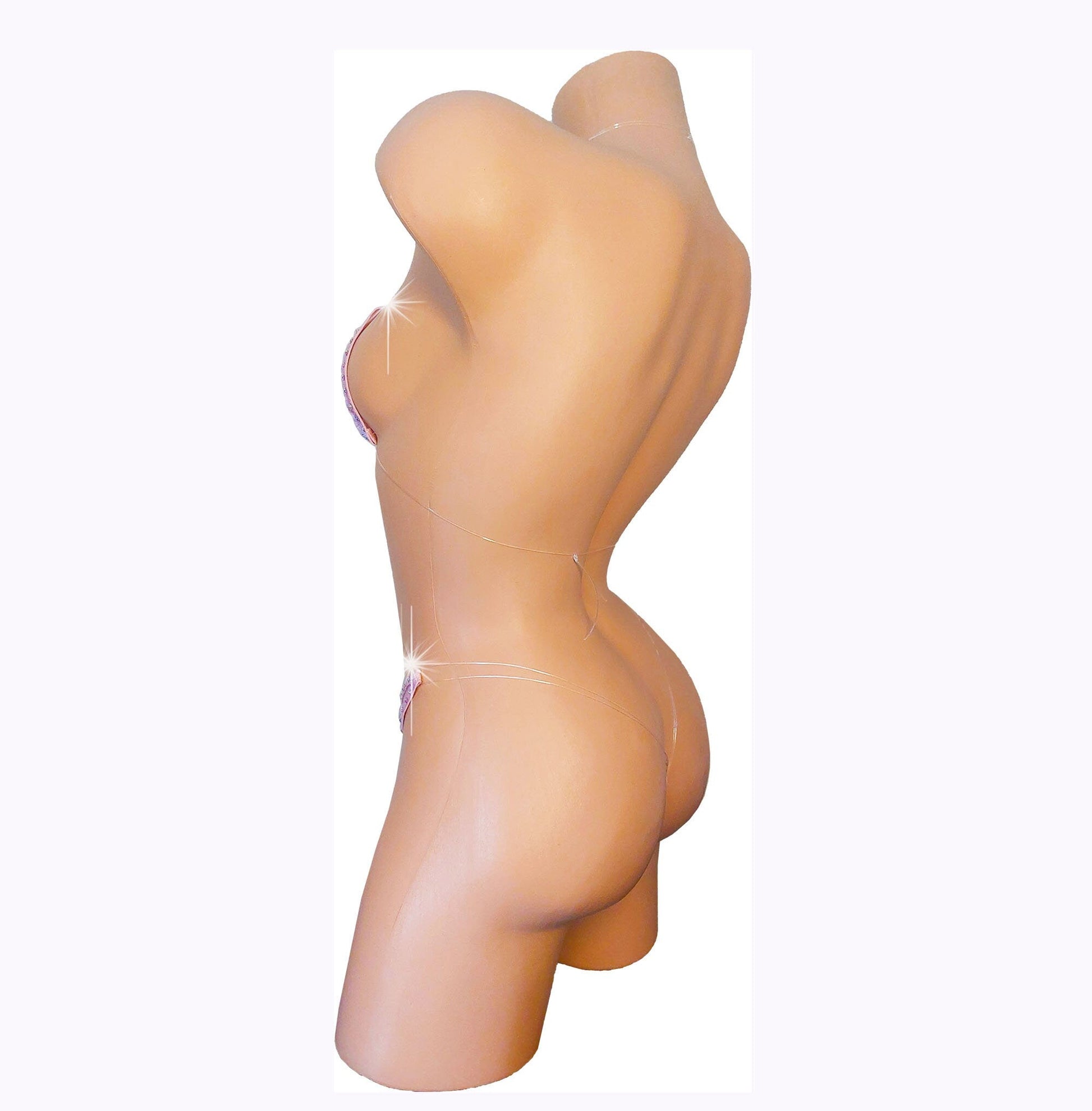 Innocent Baby Pink Lace outlined in Rhinestones! Fully lined. Mix & Match your top and bottom sizes! Clear transparent elastic cords are strong and stretchy, hard to break. Knot them where you want them for a perfect custom fit every time. Mannequin set. Invisible elastic bikini looks like you are wearing nothing! Elastic can stretch to twice it's length. Straps are doubled and will not break. Seductive and flattering to all figures.