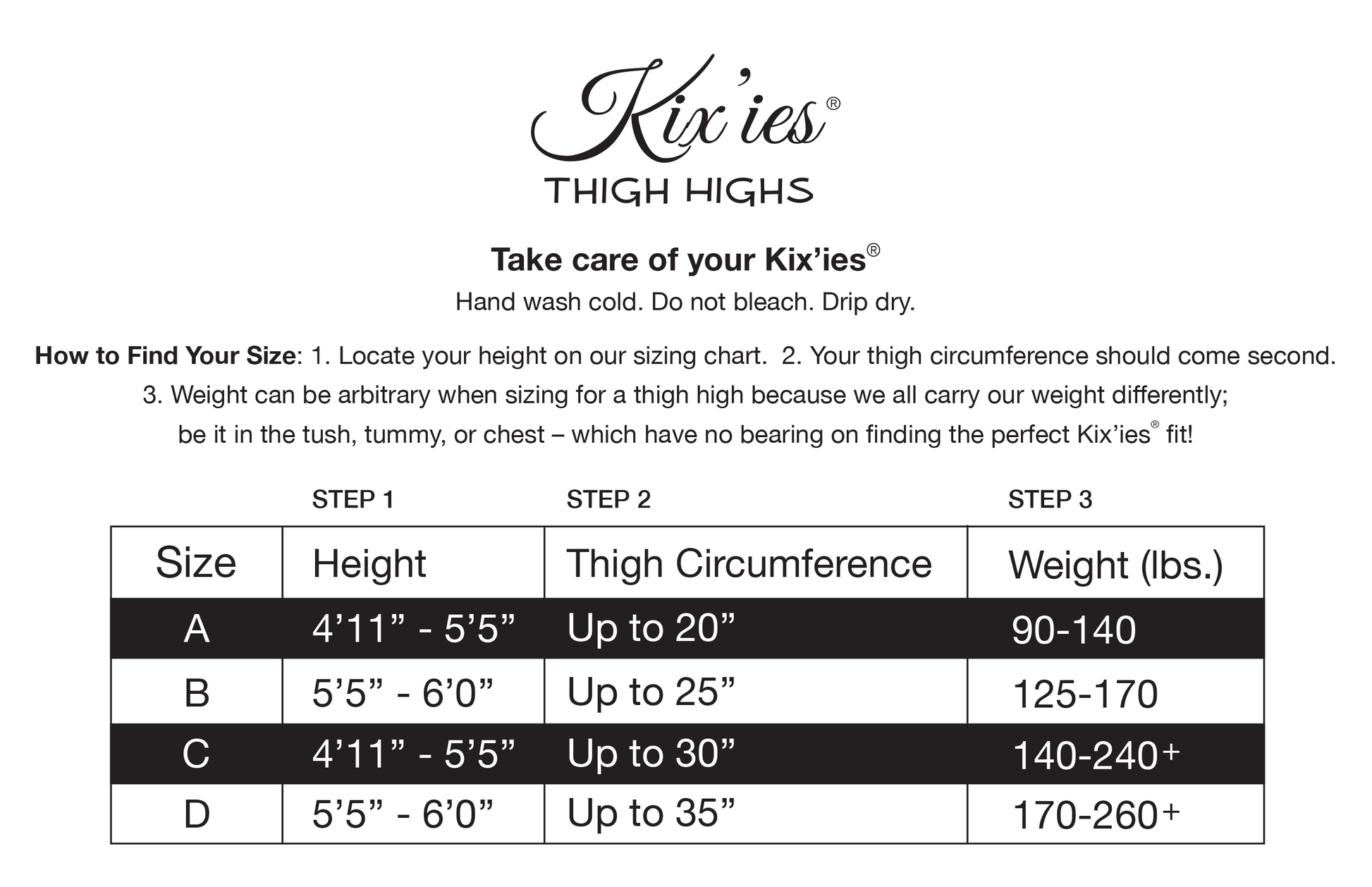 Sizing: Measure by height first and thigh circumference second. Weight can be arbitrary when sizing for a thigh-high. We all carry our weight differently; be it in the tush, tummy or thighs – which have no bearing on finding the perfect Kix’ies® fit! Time to kick those binding tights and outdated hosiery to the curb!