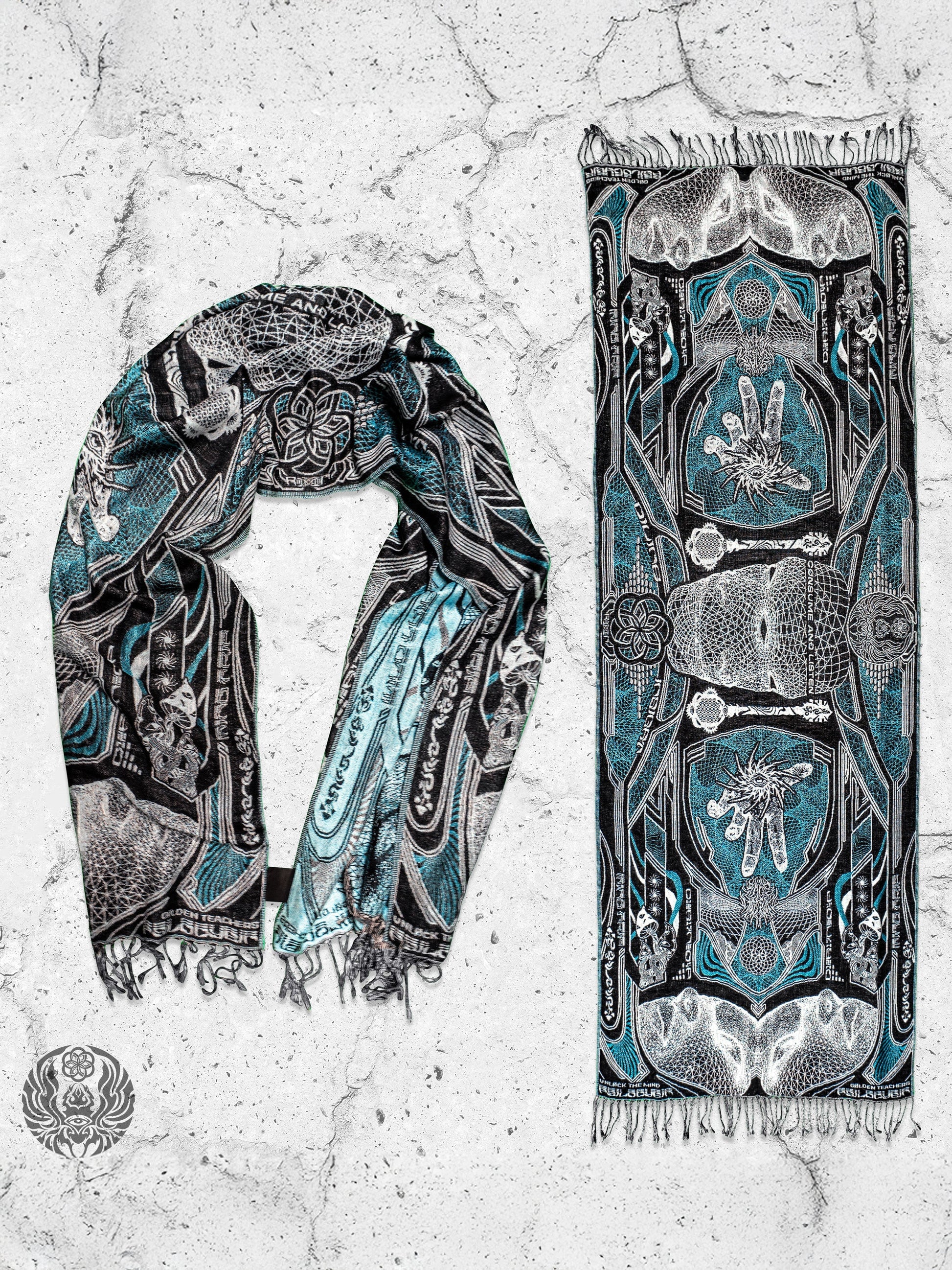 • Design Elements: Godhead in the center, Psilo***** mushrooms with eyes, Keys to represent mushrooms as tools to unlock other dimensions and understandings, The hand with eye represents the gift of divine visions being handed down from generation to generation as a sacred sacrament from it's extraterrestrial nature to the consumption by humans, at each end of the shawl there is 2 heads(people) experiencing a trip together looking up in awe (this is tribute to my very first breakthrough and we all know how indescribably magical that moment is)